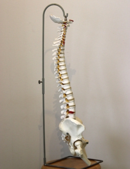 (左)背骨の骨格模型。神経は約30個の骨の間から出て全身へ張り巡らされる。