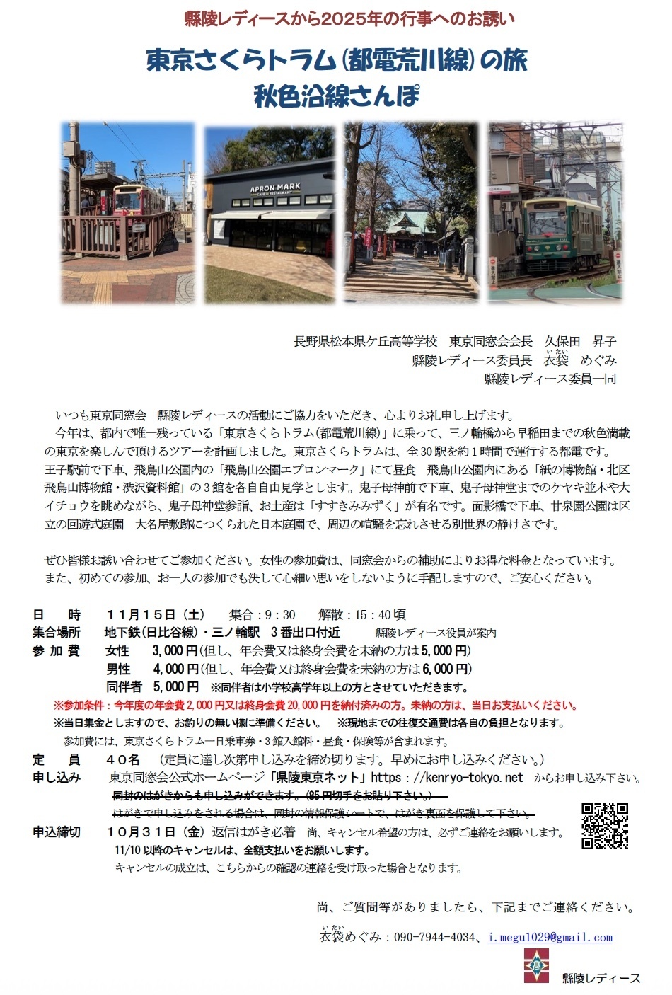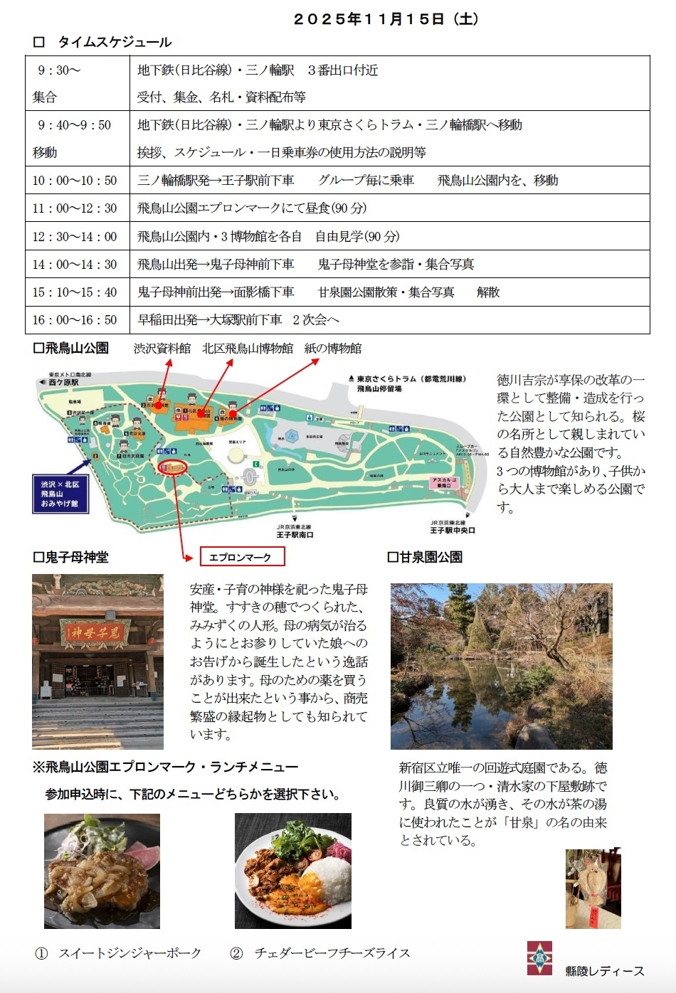 縣陵レディースのページ2025 | 2024 | 2023 | 2022 | 2019 | 2018 | 2017 | 2016 | 2015 | 2014 | 2013~2010 | 2010~2007 | 2007~2005 | 2004~2001 女性会員が集まり、バスでの小旅行や社会見学など、ユニークなイベントを企画、開催しています。参加するのは女性に限りません。小旅行や楽しい集まりを企画、実施する縣陵レディス。会は女性会員が運営していますが、イベントに参加するのに男女の区別はありません。楽しくてためになる今後の企画にご期待ください。 参加ご希望の方は10月31日(金)までに以下の参加申込フォームよりお申し込み下さい。