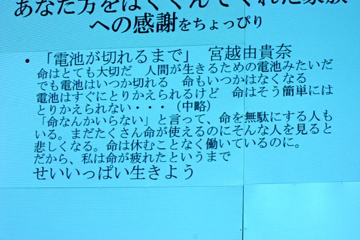 内容は脳の活性化といった医学、生理学的な話題から「いのち」の尊さについての話にうつり、生きたくても生きられないひとがいる一方で、可能性をもちながらみずからいのちを断つ若者の多いことを嘆き、いのち、生きることの大切さ、すばらしさをもう一度考えてみようという熱い思いが伝わり、心打たれるものでした。