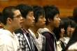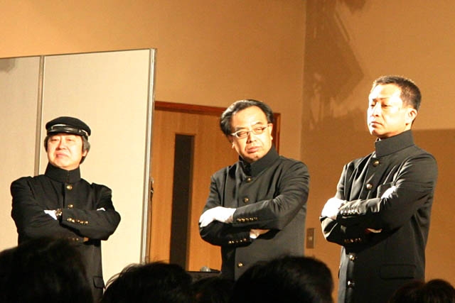 ということで、昔の恐怖の応援練習を在校生を前に実演。巨大な応援旗はためくもと、コワモテ応援団がにらみをきかす。「ぼやぼやしてんじゃねえ!」などとどなられながら応援歌を歌うあの体験はみな一生忘れないはず・・。そしてそういう経験がちょっと自慢でもある・・。