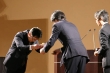 輝かしい実績を持つ彼が現役生の伴走をともなって会場に入って来ると、大きな拍手が。そのまま壇上にかけあがり、”滝のような汗をぬぐおうともせず、在校生へ熱いメッセージを送りました。