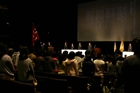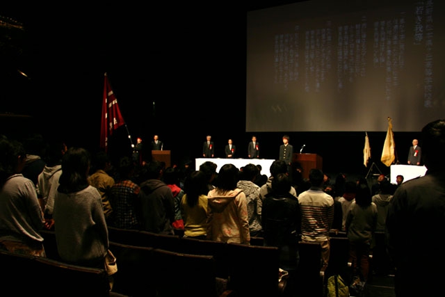 いまや恒例となった応援練習再現。今年の応援団長はかつてないほどの「硬派」イメージで会場の度肝を抜きます。発声練習のあとは「覇権の剣」。母校開校90周年にちなみ「基定めて九十余年」と歌われました。