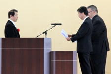 永原経明学校長の式辞では制服制帽の規定がなくなった当時のエピソード、佐藤彦雄同窓会長の祝辞では県陵三大精神に象徴される母校の伝統等がそれぞれ語られました。愛のリレー実行委員長田多井健介さんは「おれ。おまえたち」で在校生にかたりかけました。