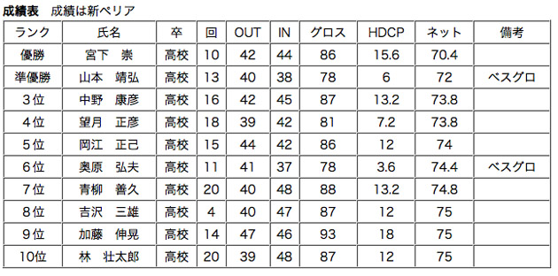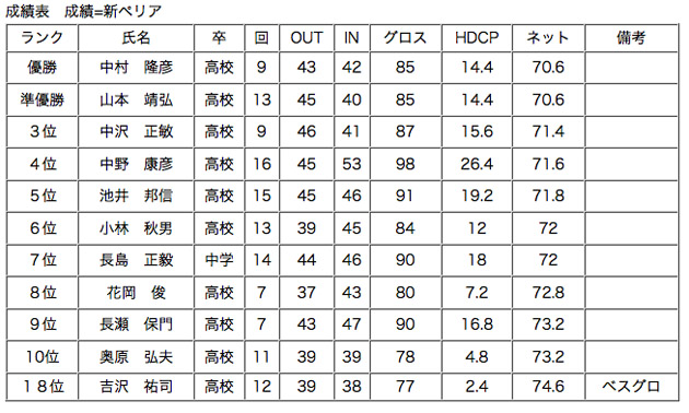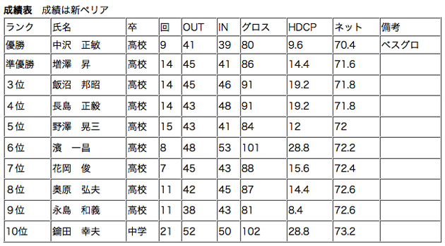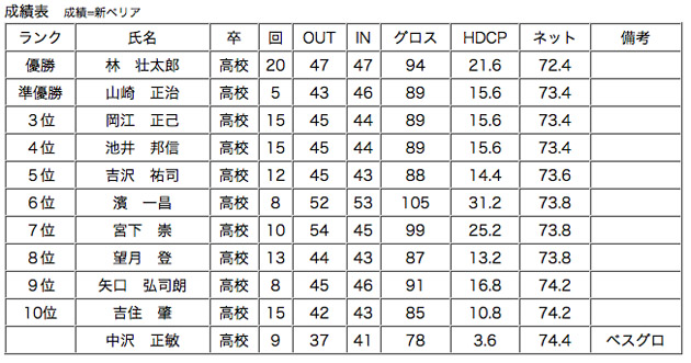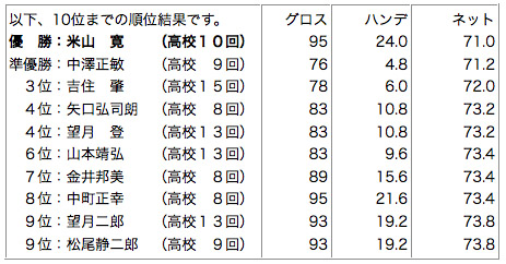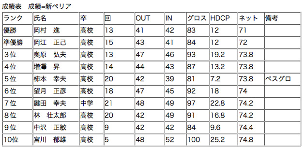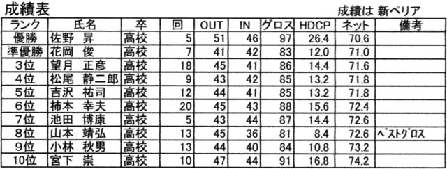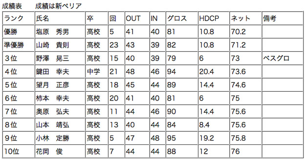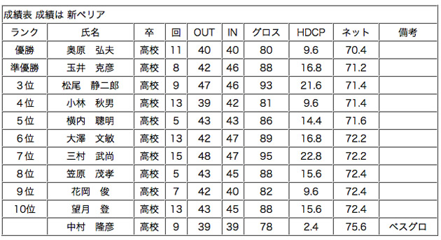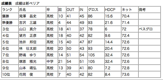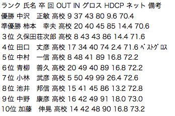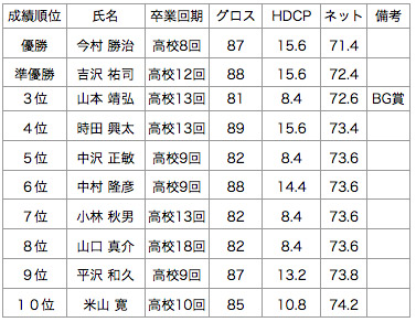 ランク | 氏名 | 卒 | 回 | OUT | IN | グロス | HDCP | ネット |