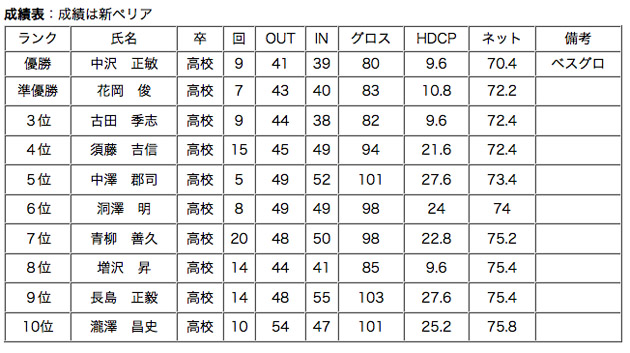 11位 | 中澤 正敏 | 高校 | 9 | 40 | 43 | 83 | 7.2 | 75.8 | ベスグロ |