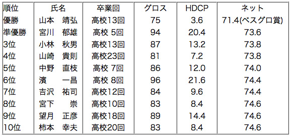 優勝は16回卒の中野康彦氏、準優勝18回卒の山口真介氏と同ネットスコアでありましたがアルペン会規程により年齢上位者が獲得されました。
