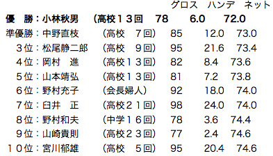 ランク氏 名卒アウトイングロスHDCPネット優勝中野 康彦1649449320,472.6同スコア準優勝山口 真介184140818.472.6同スコア3位因幡 敏朗2047449118.073.04位大蔵 章男204040806.074.0ベスグロ5位柿本 幸夫2043428510.874.2