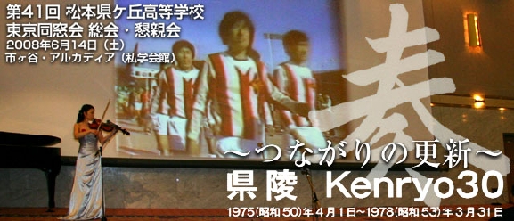 30回卒のみなさんの誇り、全国高校サッカーベスト8進出の試合のビデオ上映は、今回の最大の目玉。国立競技場にわが県陵チームがプラカードを先頭に行進するシーンでは拍手が沸き起こりました。その後も県陵がアップになるたびに大拍手!試合の結果はわかっていても、ボールの行方に一喜一憂。おしいシュートにはまるで実況を見るかのようなため息さえ漏れていました。そして終了3分前。歴史に残る決勝ゴールに大歓声があがりました。ゴールを決めたヒーロー小野さんも壇上にあがり、県陵サッカーの今後に熱い期待を込めてエールを送っていました。ビデオ発見から奇跡的にこれを再生するまで、ソニー、 日本テレビ、Jリーグをも巻き込んでのストーリーもまさに 一巻のドラマといえるものでした。