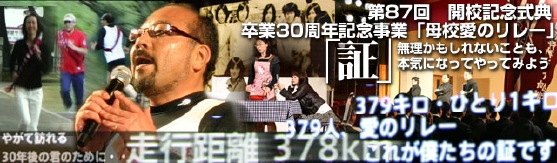 ひとり1キロの映像の前後には現役のみなさんの将来の夢や希望も紹介。つきたい仕事、行ってみたい場所など。「愛する人を守りたい!」という女生徒もいて、それは頼もしいこと。リレー映像は家族の協力をあおいだり、各クラスごと、職場の縣陵出身者、クラブの仲間と一緒になど、申し合わせて集まって収録したりしたもの。そしてもちろん東京同窓会のメンバーでも連絡を取り合って撮影されました。バックに流れる曲は当時のヒットメドレー。